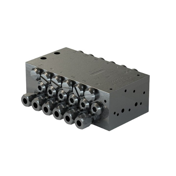 Verteiler vom Typ SSVD sind kompakte Progressivverteiler mit Blockbauweise, bei denen sich die Dosiermenge mithilfe verschieden großer Dosierschrauben einstellen lässt. Durch die Schraube wird jeweils die Dosiermenge eines gegenüberliegenden Auslasspaares dosiert. Auslassarmaturen lassen sich direkt, ohne zusätzliche Dichtung anbringen. Dieser vielseitige Verteilertyp ist in vielen verschiedenen Ausführungen hinsichtlich Überwachungsart und Oberflächenbeschichtung erhältlich.